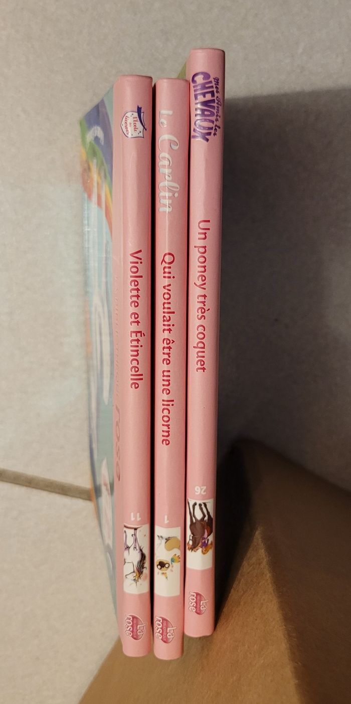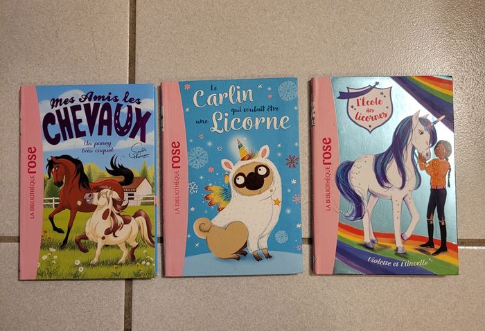 Vends un lot de 3 livres bibliothèque rose Mes amis les chevaux tome 26 un poney très coquet Le carlin tome 1 qui voulait être une licorne L'école des licornes tome 11 violette et étincelle