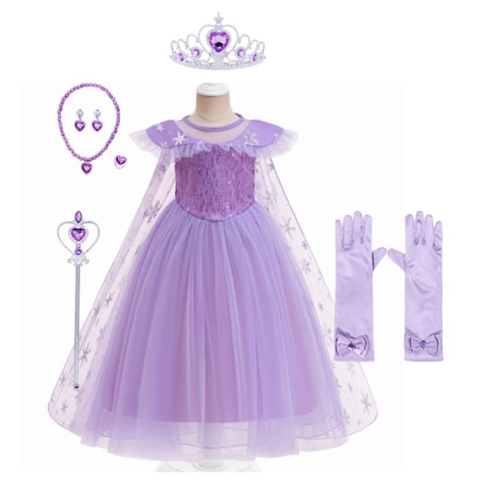 Déguisement robe princesse violette Elsa et ces accessoires (couronne, baguette, bijoux, gant). 1 taille disponible : - 5-6ans : longueur de la robe 85cm, Vendu dans leur pochette d’emballage d’origine, idéal pour faire un cadeau ! Expédition rapide après votre commande.