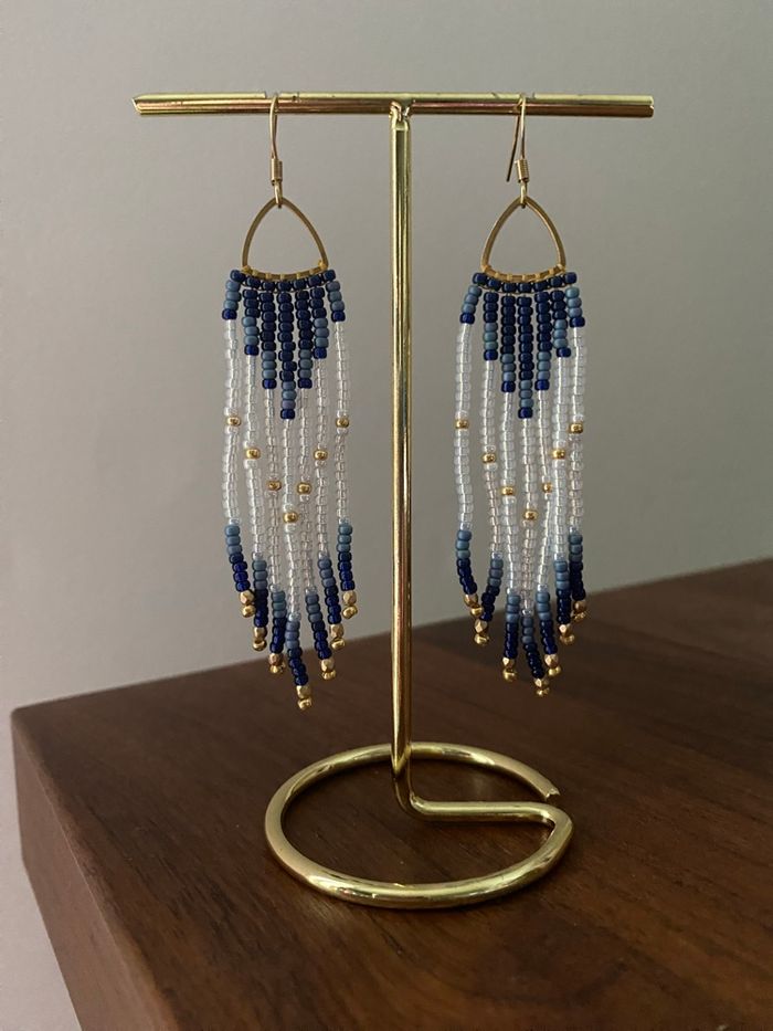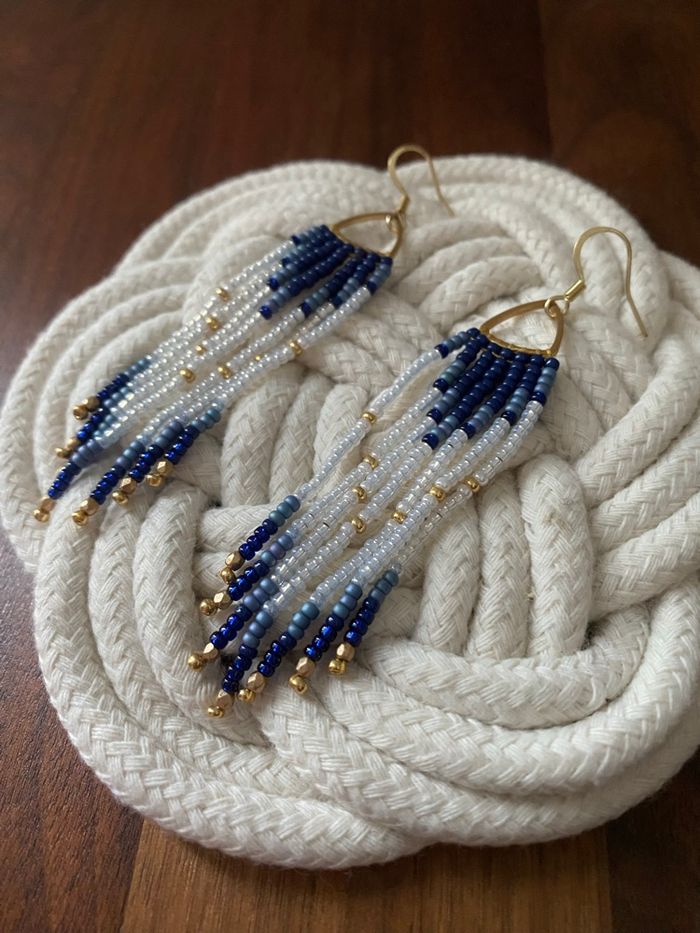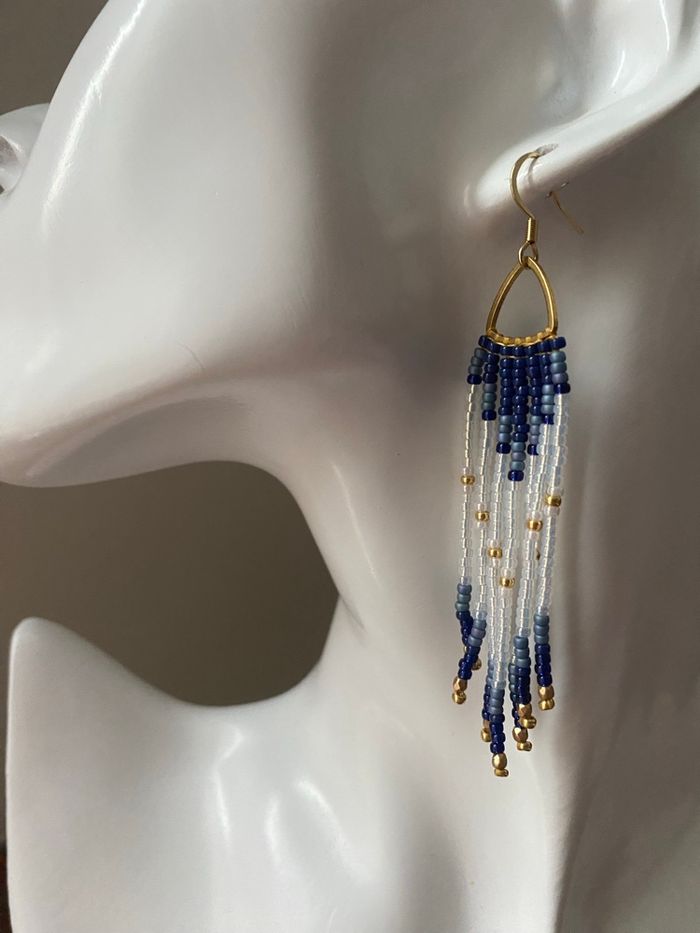 Boucles d’oreilles Miyuki Crochets d’oreilles et supports en acier inoxydable doré à l’or fin. Longueur totale des boucles d’oreilles environ 8,5 cm. Article neuf.