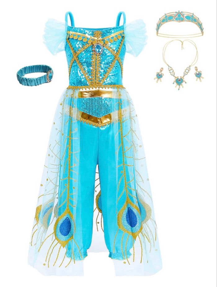 Déguisement princesse Jasmine et ces accessoires (couronne, bijoux). 1 taille disponible : - 7-8ans : longueur du top + cape 100cm, longueur du pantalon 70cm, Vendu dans leur pochette d’emballage d’origine, idéal pour faire un cadeau ! Expédition rapide après votre commande.