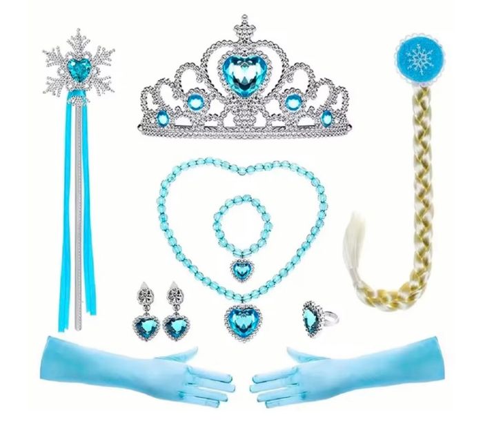 Lot d’accessoires princesse bleu Elsa composé d’une paire de gant, d’une couronne, d’une baguette, d’une tresse, d’un collier, d’un bracelet, d’une bague et d’une paire de boucle d’oreille. Taille unique, convient aux petites filles de 3-6ans. Vendu dans leur pochette d’emballage d’origine, idéal pour faire un cadeau ! Expédition rapide après votre commande.