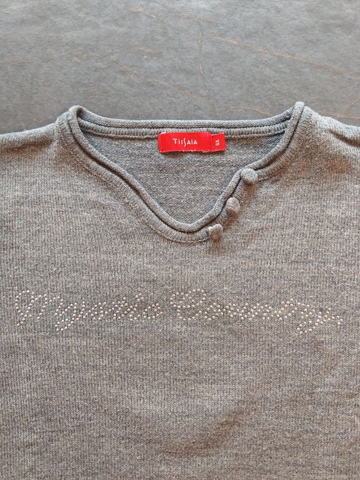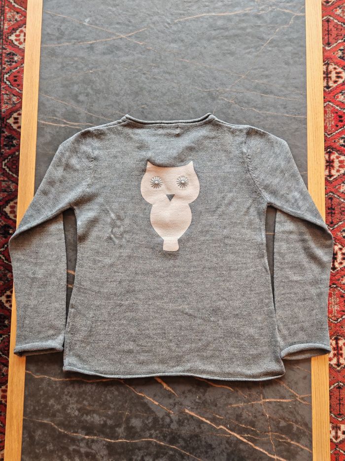 Joli petit pull gris chiné, fin, Tissaia, 8 ans, en très bon état. Col en V avec 3 petits boutons décoratifs, mystic country écrit en petits diamants brillants (qui ressort beaucoup mieux en réalité que sur la photo), motif chouette au dos, empiècements aux coudes. Bords du pull et des manches roulés. En coton et polyester, mais l'étiquette de composition a été coupée car elle grattait.