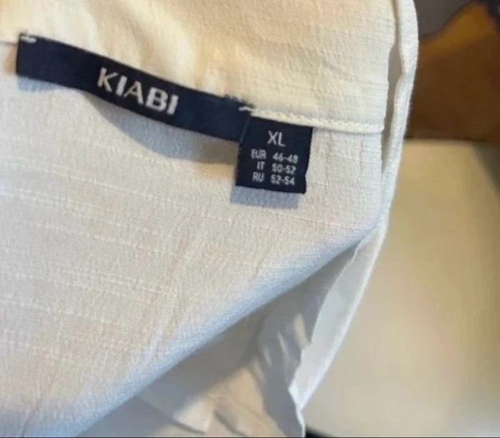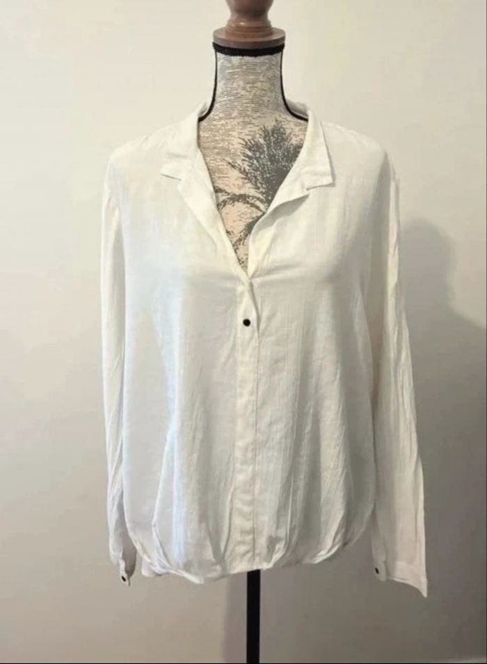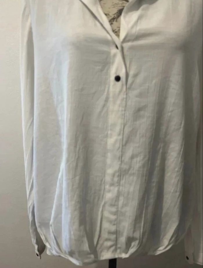 Très jolie chemise fluide blanche Effet boule devant et plus longue derrière. très bon état Taille 46/48 mais peut se porter en oversize