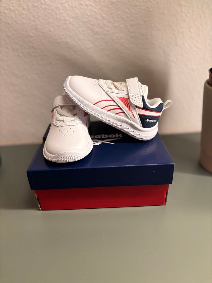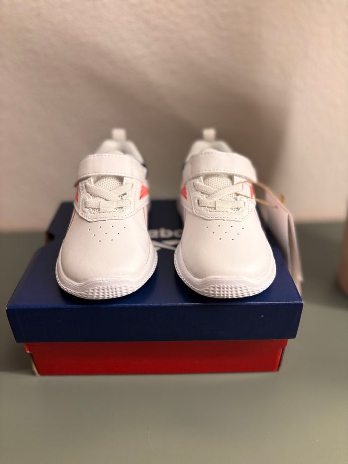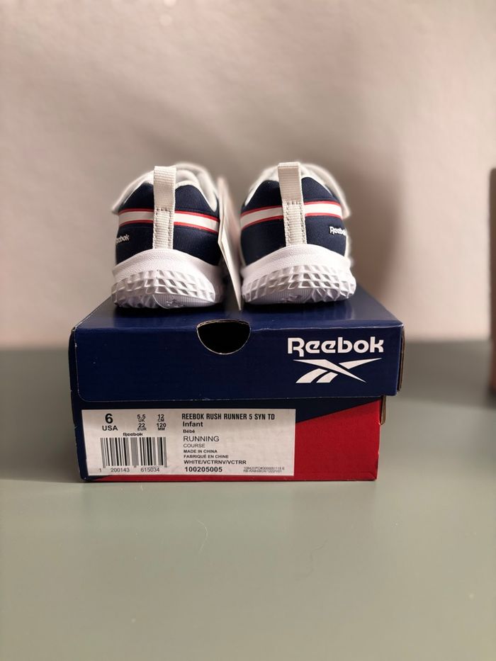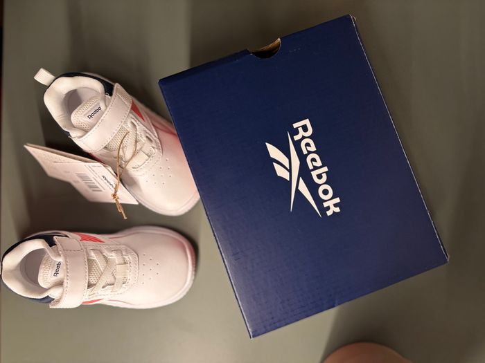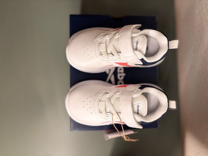 Vends une paire de baskets Reebok modèle Rush Runner 5 TD pour bébé/enfant. Idéales pour l'apprentissage de la marche et les activités quotidiennes grâce à leur légèreté et leur maintien. • Marque : Reebok. • Pointure : 22 EUR (6 USA / 5.5 UK / 12 cm). • Couleurs : Blanc (White), bleu marine (Vector Navy) et rouge (Vector Red). • Fermeture : Pratique avec bande auto-agrippante (scratch) et lacets élastiqués pour un enfilage facile. • État : Neuves avec étiquette. Jamais portées, les semelles sont impeccables. • Inclus : Boîte d'origine et papier de protection. Les points forts : Une basket solide et stylée avec une semelle extérieure texturée pour une bonne adhérence. Le combo de couleurs est un classique indémodable qui s'accorde avec tout. Envoi rapide et soigné ‼️Photo et vidéo de l’emballage avant envoi‼️ N’hésitez pas à regarder le dressing 🤗