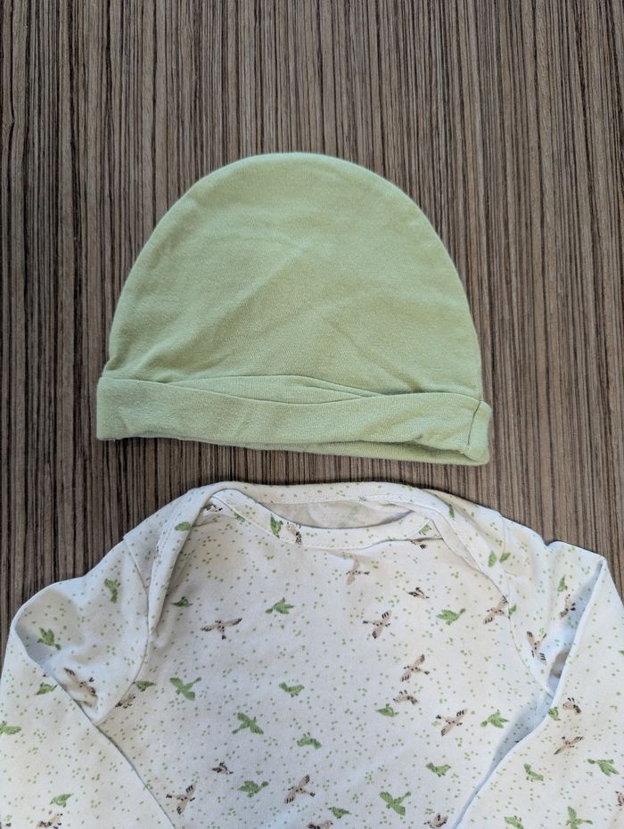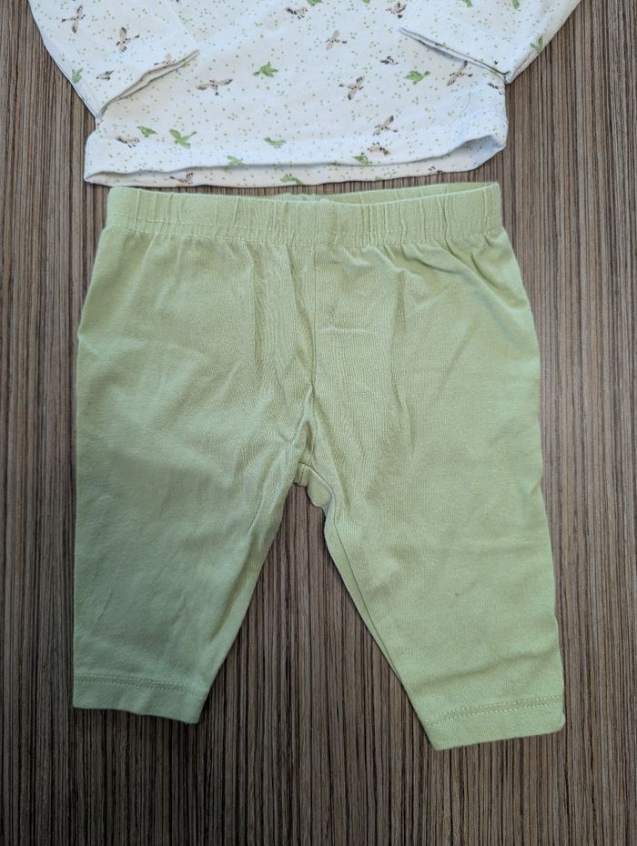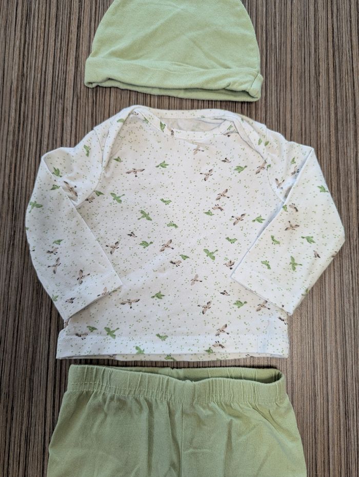 Ensemble haut + pantalon + bonnet Couleur vert clair et blanc Avec dessin d'oiseaux Taille 50-56 cm Marque Okeo Tex