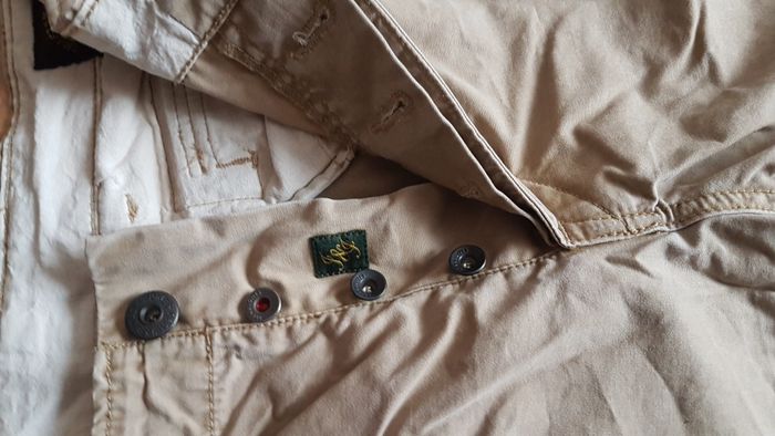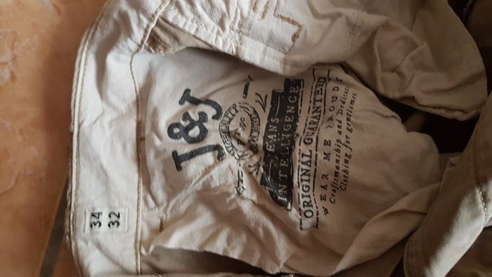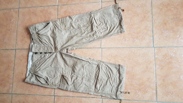 Bermuda homme Taille 42-44 (34-32) Couleur beige 2 poches hautes, 2 poches à bouton et rabat sur les côtés et 2 poches arrière à bouton et rabat Fermeture à boutons Cordon au bas du bermuda pour resserrage éventuel Marque Black & Jones