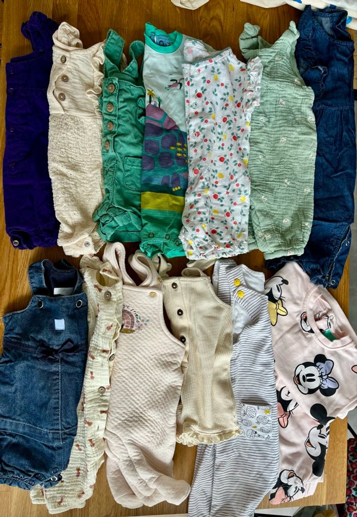 Combinaisons été manches courtes sauf l’ensemble sweat et pantalon Minnie Mickey En très bon état voire comme neufs pour certains articles 0-6 mois Multi marques Indications : ma fille est née en juin 2024