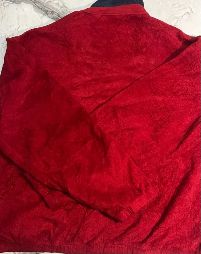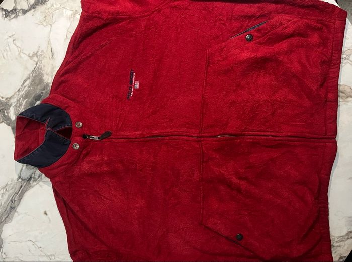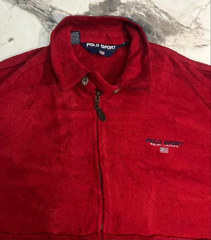 Veste vintage Polo Sport Ralph Lauren en polaire Polartec rouge, fabriquée aux États-Unis (années 90). Elle présente un col montant bleu marine, une fermeture éclair avec tirette en cuir et le logo drapeau brodé.