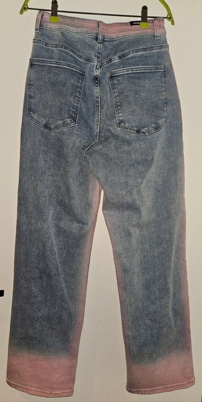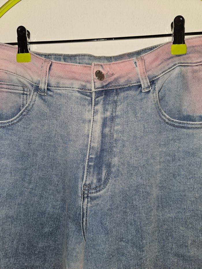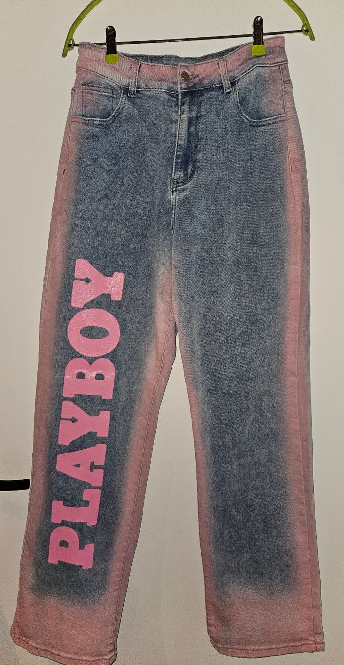 Jean couleur bleu clair délavé et flocage Playboy rose, collection Missguided Se porte large, taille 38