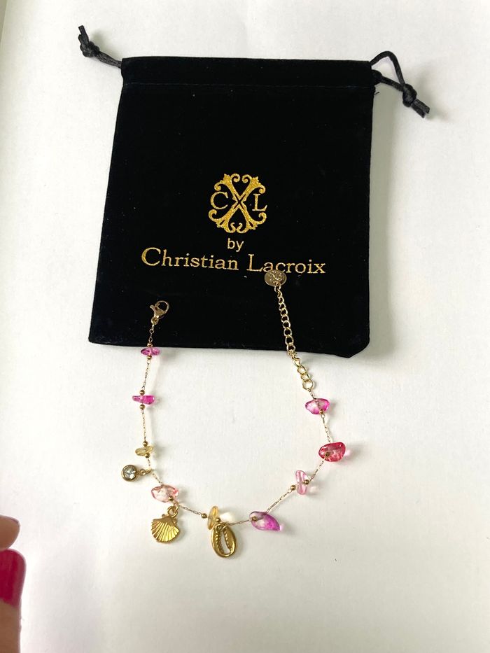 Bracelet doré avec breloques coquillages, zircons CXL by Christian Lacroix Longueur réglable. Fermoir mousqueton. Coloris : doré et rose Matière : laiton Neuf, jamais porté Prix boutique : 65€