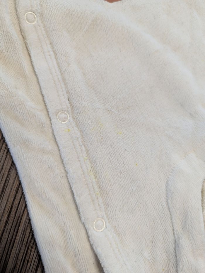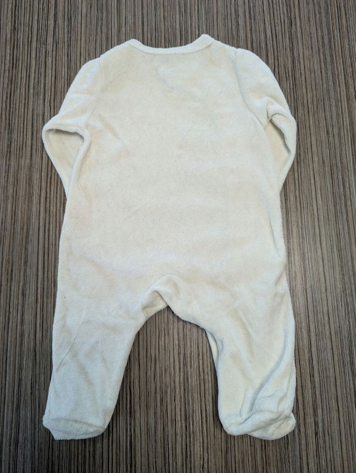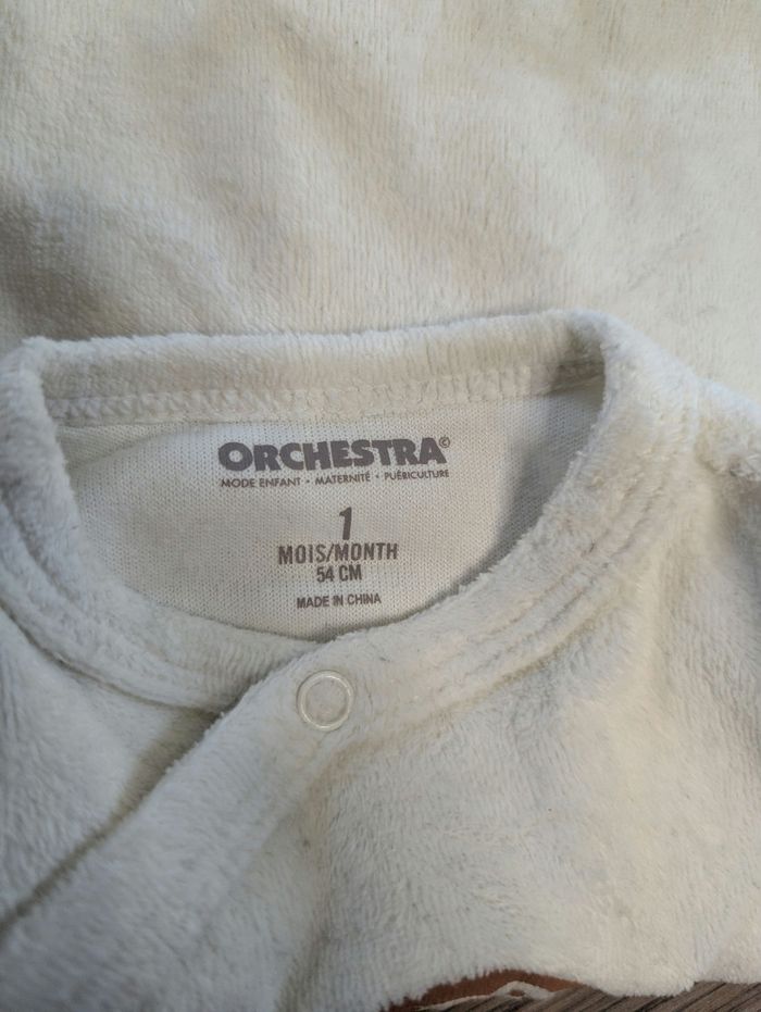 Grenouillère Avec dessin de lion Couleur blanc, brun et vert Taille 1 mois / 54 cm Marque Orchestra Il y a une toute petite tâche qui ne se voit quasiment pas (voir dernière photo)