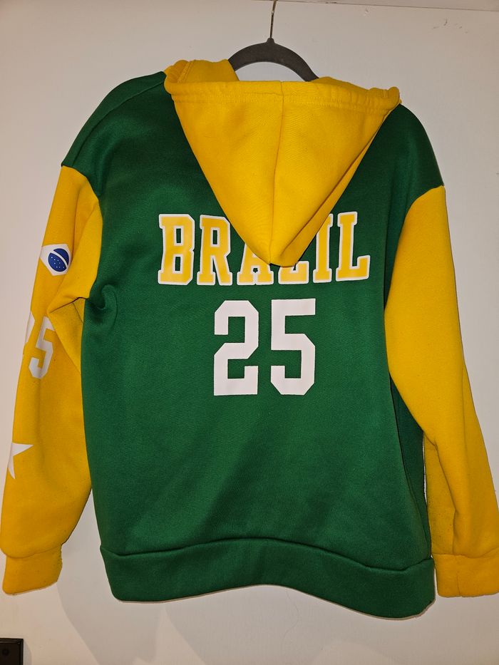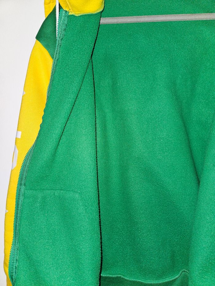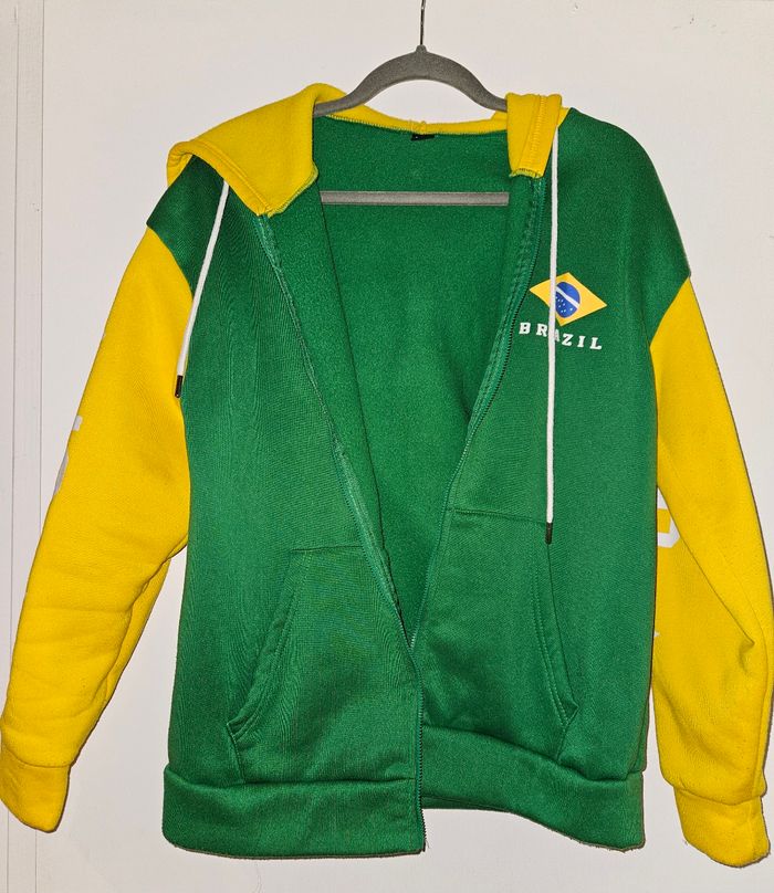Gilet/Veste molleton vert et jaune Motif Brasil, tient bien chaud, matière très douce et agréable Porté 1 fois mais taille un peu grand pour moi Taille M/38, taille grand