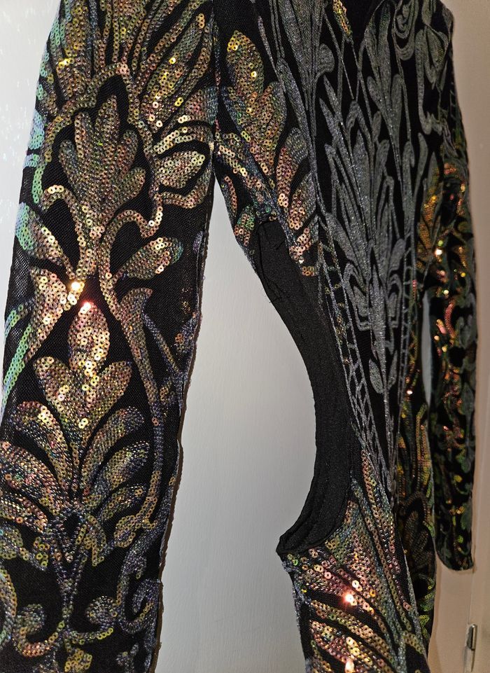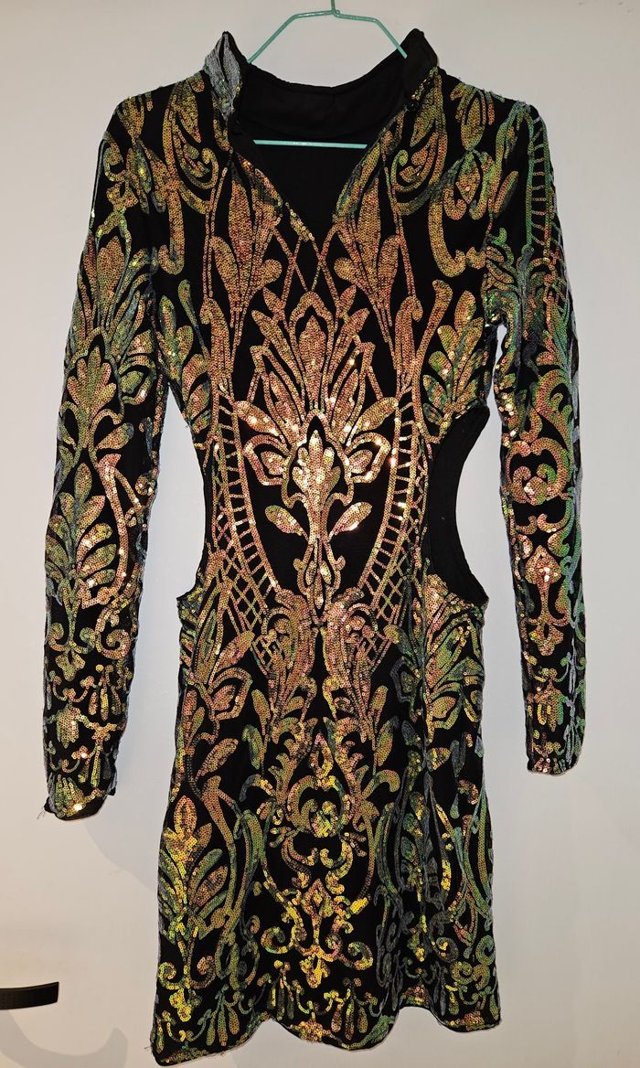 Robe femme fond noir et motifs en sequin doré aux reflets verts Ouvertures sur les côtés Se porte près du corps, taille M/38 Portée 1 fois seulement