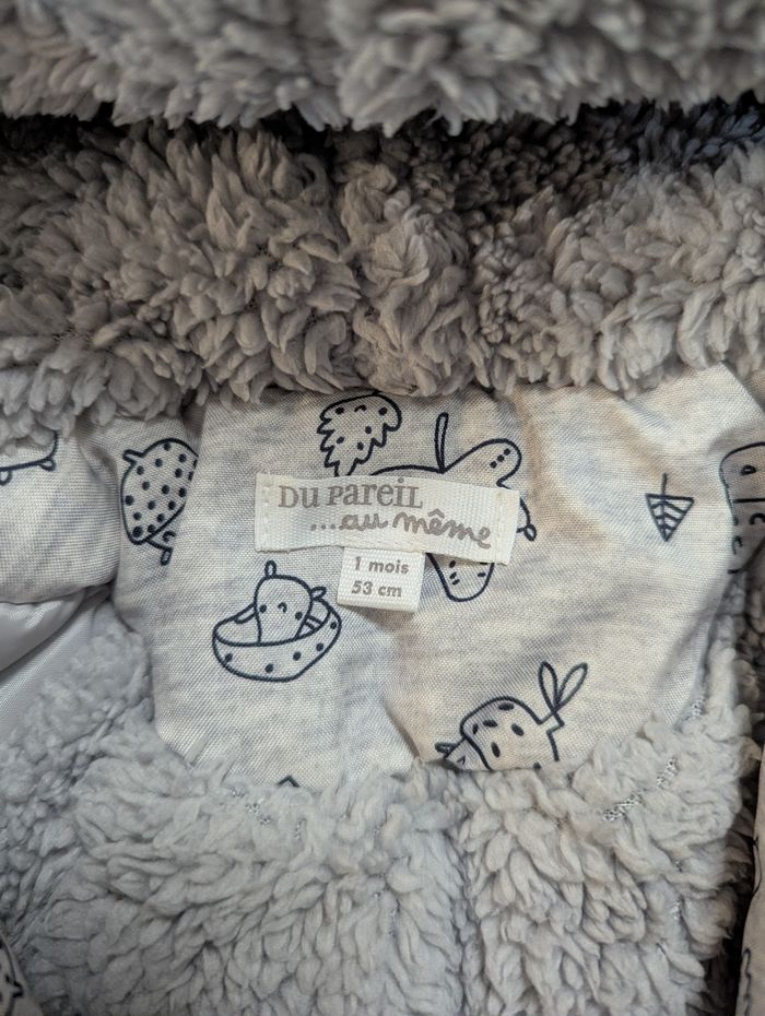 Combinaison polaire Avec capuche et moufles intégrées Couleur gris et noir Avec dessins de champignons, feuilles et fruits de la forêt Taille 1 mois - 53 cm Marque : Du pareil au même