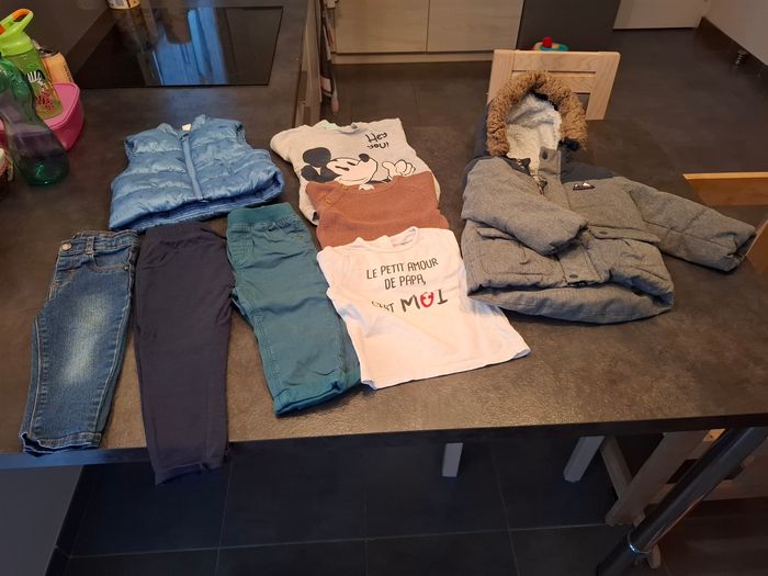 18mois 1 doudoune sans manche Tex baby 1 pantalon Npo baby 1 pantalon vertbaudet 1 pantalon kiabi 1 pull Disney 1 pull vertbaudet 1 Tee-shirt vertbaudet 1 manteau C&A