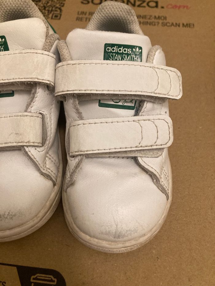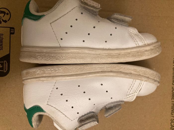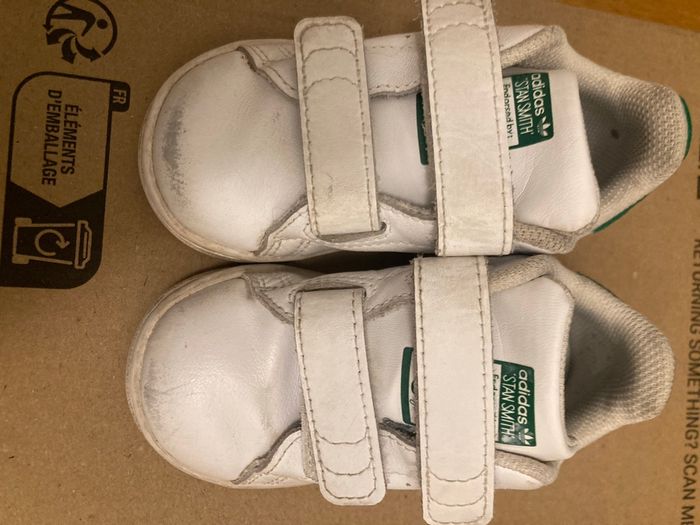 Chaussures de la marque Adidas, pointure 22. Modèle Stan coloris blanc. Traces d’usure visibles sur photo, devant un peu râpées. Portées mais restent en bon état. Envoyées dans leur boîte d’origine. #stansmith #adidas