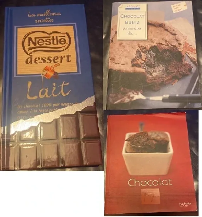 Le lot contient 3 livres: - chocolat (couverture marquée sur le haut à droite. voir photo) - Chocolat mania gourmandises ultra - Les meilleures recettes nestlé dessert Livres en très bon état. Si plusieurs livres pris, je ferais un prix pour le lot. Pour voir tous les livres que j'ai à vendre, mettez en recherche #mariejo2888livres