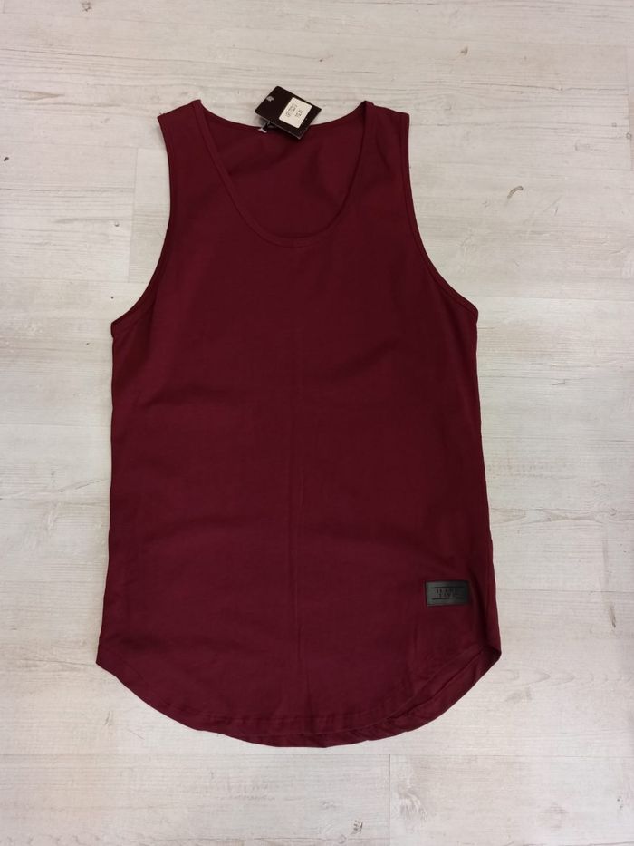 Débardeur ou t-shirt sans manche pour homme de couleur bordeaux. Uni sur le devant et l'arrière. Coupe arrondie sur le bas. Mesure dessous de bras à dessous de bras : 52cm. Article neuf avec étiquette. Vendu en magasin à 19,99€. Débardeur IF bordeaux XL