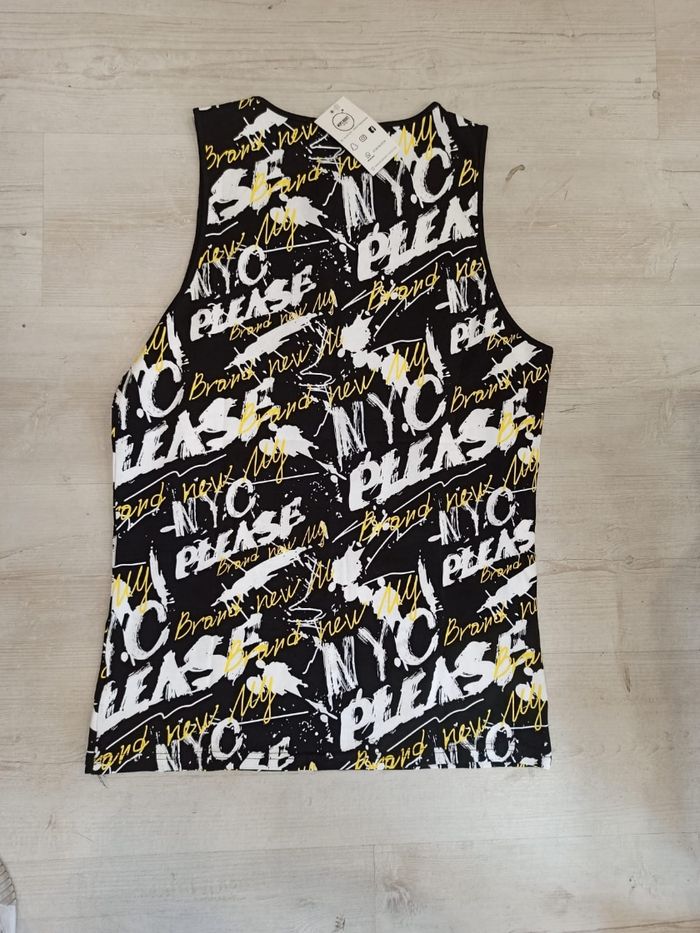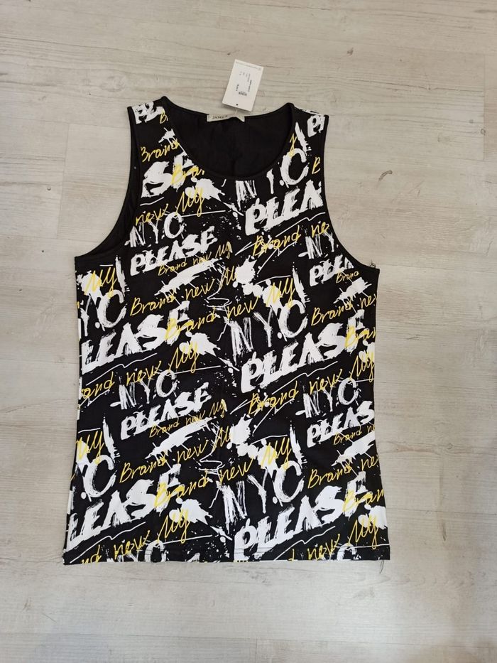 Débardeur ou t-shirt sans manche pour homme de couleur noir avec flocage jaune, et blanc. Les dessins sont les mêmes sur l'arrière. Coupe droite sur le bas. Mesure dessous de bras à dessous de bras : 50cm. Article neuf avec étiquette. Vendu en magasin à 18,99€. hxt20268 noir L