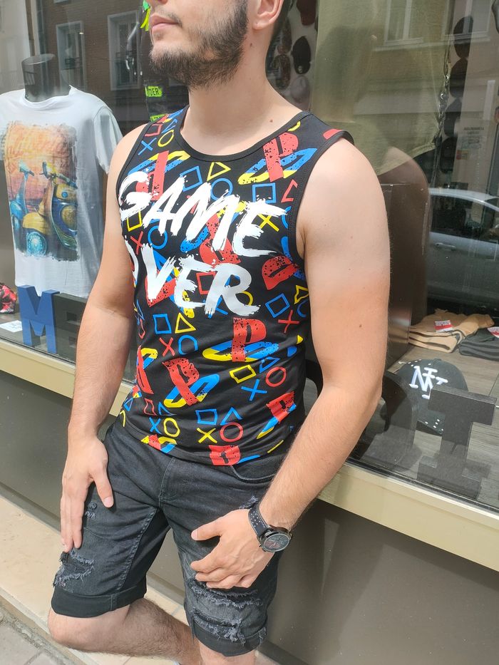 Débardeur ou t-shirt sans manche pour homme de couleur noir. Flocage sur le devant, uni sur l'arrière. Coupe droite sur le bas. Mesure dessous de bras à dessous de bras : 44cm. Article neuf avec étiquette. Vendu en magasin à 18,99€. Ks01028 noir