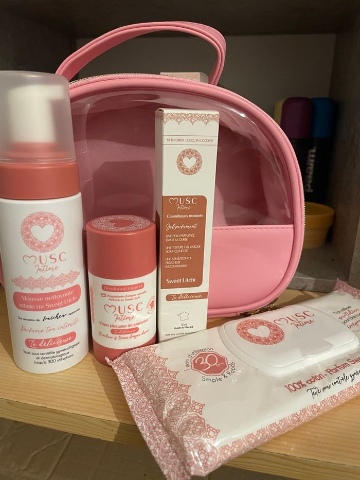 Musc intime trousse complète sweet litchi neuve Composé de Une mousse nettoyante Un gel parfumant (musc) Un déodorant naturel Des lingettes