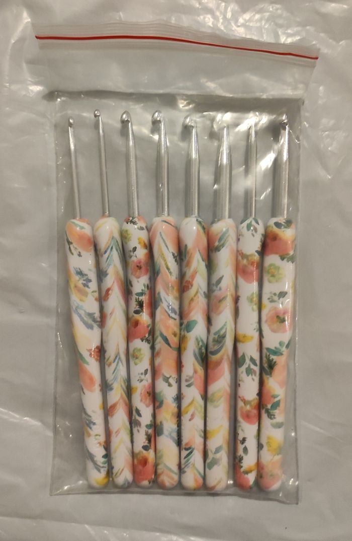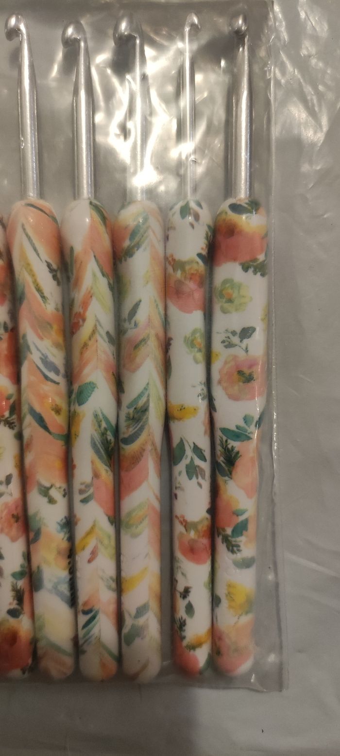 Set de 8 crochets au design floral élégant. Leurs poignées ergonomiques offrent une prise en main confortable, idéale pour crocheter des heures sans fatigue. Détails du kit : 8 tailles incluses: 2,5 mm, 3,0 mm, 3,5 mm, 4,0 mm, 4,5 mm, 5,0 mm, 5,5 mm et 6,0 mm. Confort: Manches ergonomiques doux au toucher pour une glisse parfaite. Design: Motifs à fleurs colorés, chaque crochet est unique. Pratique: Les tailles sont clairement indiquées sur chaque manche. État: Neuf, sous emballage protecteur. Parfait pour débuter ou pour compléter votre collection de mercerie avec style!