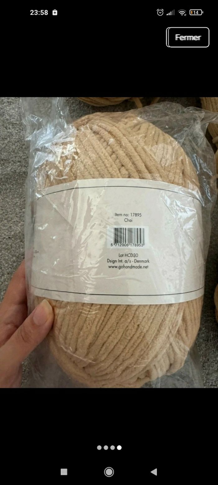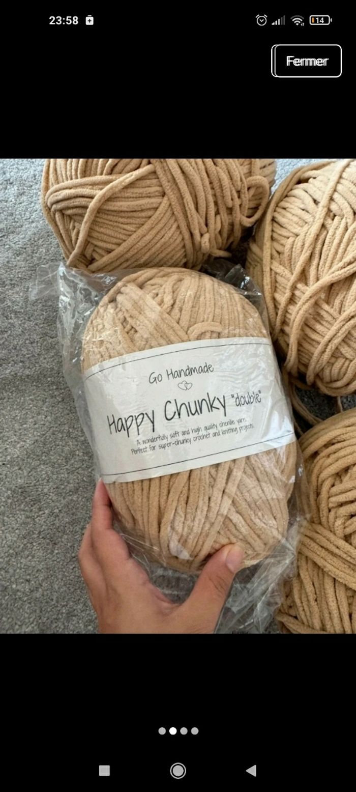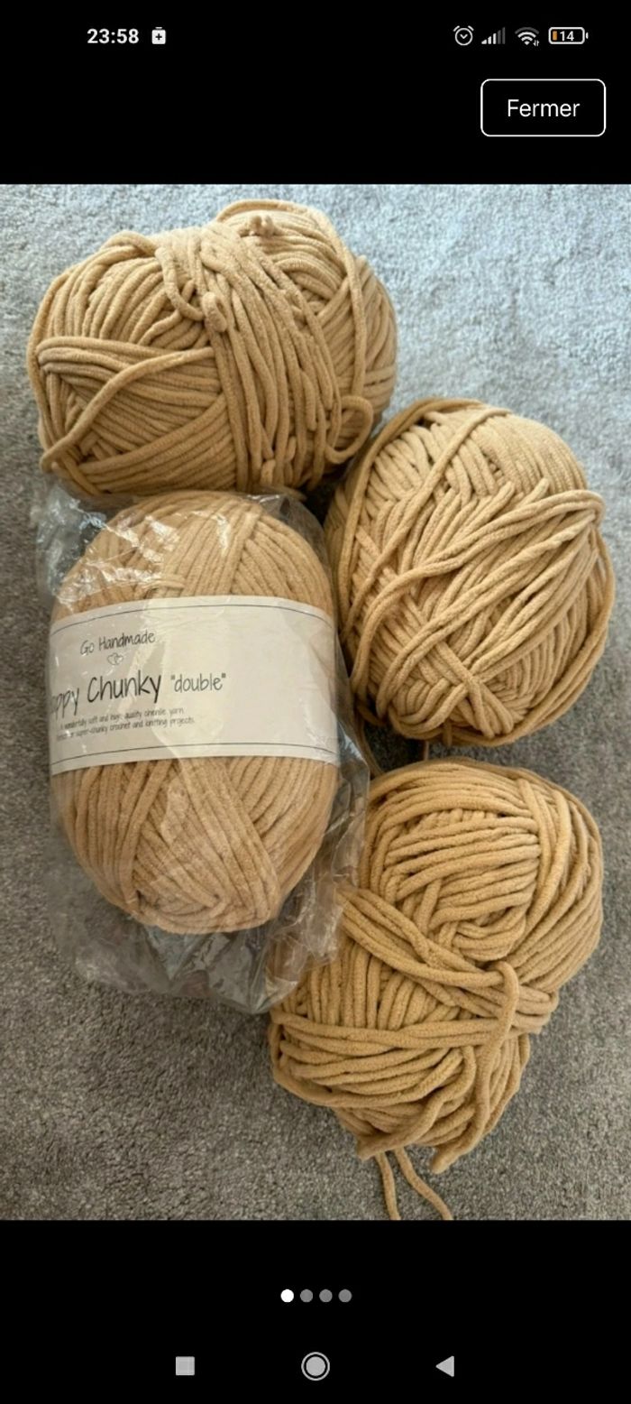 Je vends un lot de laine Happy Chunky "Double" de chez Go Handmade. Ce fil n'est plus commercialisé (article arrêté), c'est une occasion unique de se procurer ce coloris et cette qualité premium. Quantité: 4 énormes pelotes (Total environ 1 kg). État : 1 neuve sous blister de 300g + 3 très légèrement entamées (quasiment pleines, voir photos). Couleur: Moutarde / Ocre doré. Valeur neuve : 28,50 € la pelote (soit 114 € le lot). Ce fil chenille XL est d'une douceur et d'une densité incomparables, idéal pour des ouvrages luxueux et volumineux.