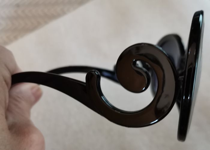 Lunettes de Soleil "Marque", monture légère couleur noir à fantaisie aux branches, verres noir, (logo de la marque et indices effacés), tbé, prix définitif.