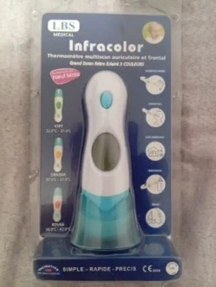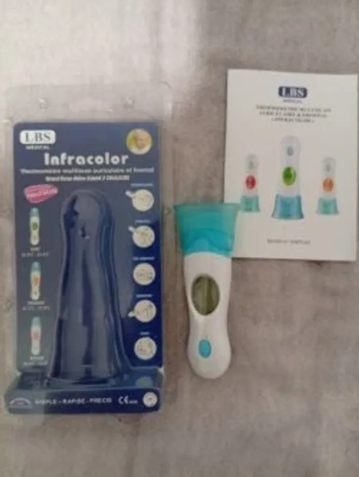 Thermomètre multi scan auriculaire et frontal Marque LBS ouvert utilisé 2 fois , le socle un peut gratter mais rien de grave mon fils avait joué avec . Fonctionne