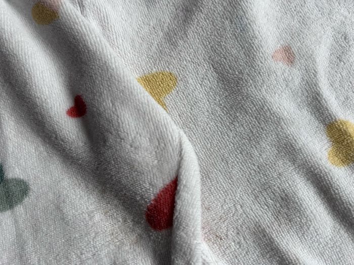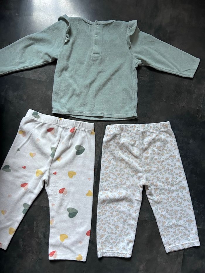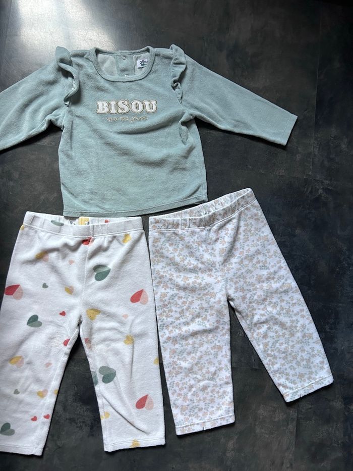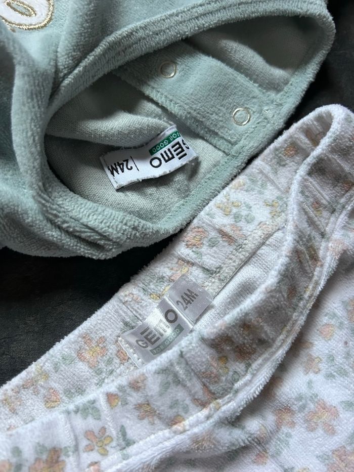 Pyjama velours 2 pièces 2 ans Gemo 75% coton 25% polyester Le haut vert bisous est en bon état , tache d’encre très légère Le bas coeurs est légèrement taché à l’entrejambe Je donne avec Le bas fleuri, il a une petite entaille en bas de chaque jambe