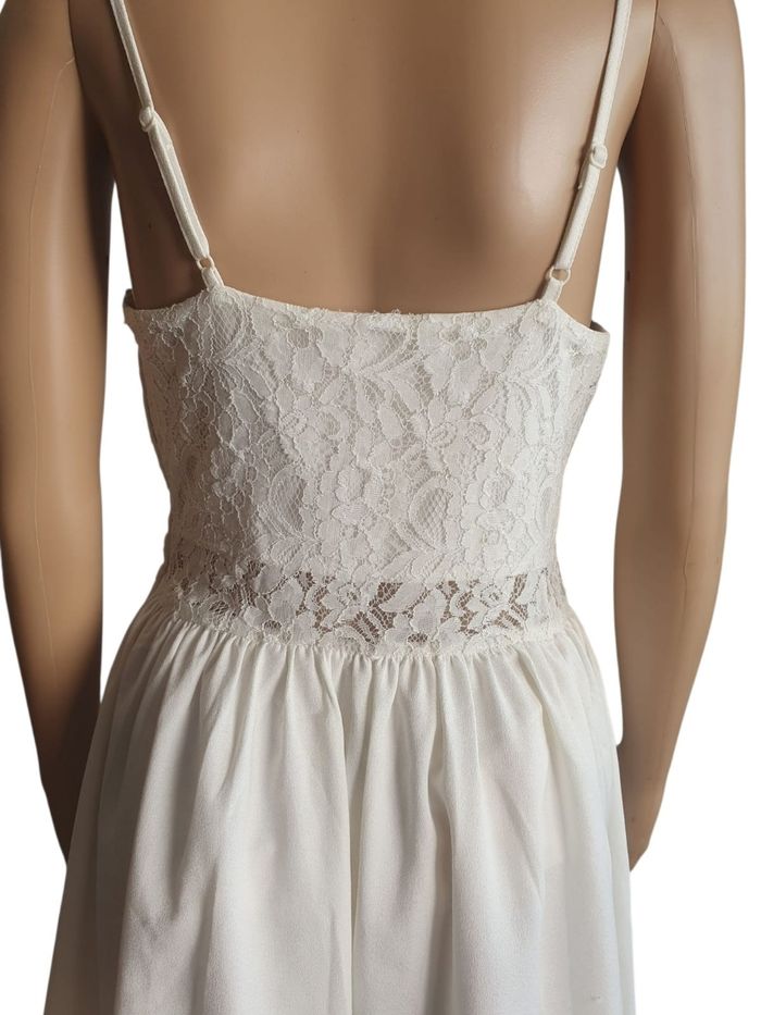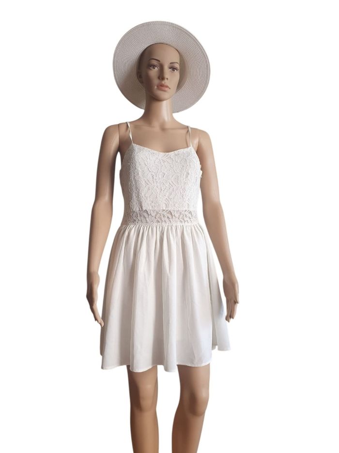 S'il ne fallait en choisir qu'une pour glisser dans sa valise , ce serait elle ! Cette robe H&M nous a séduits par son apparente simplicité qui cache une élégance folle. Sa fluidité et son jeu de dentelle en font une pièce caméléon , capable de vous accompagner du matin au soir avec une classe naturelle.  💛 Détails Raffinés : Un bustier délicatement recouvert de dentelle florale qui se prolonge sur une ceinture travaillée,  soulignant la taille avec finesse.  🩷 Coupe Féminine : Des bretelles fines réglables pour un ajustement parfait et une jupe fluide, patineuse, qui accompagne chacun de vos mouvements.  🩵 Dos droit et Épuré, mettant en valeur la dentelle qui encercle la taille.  💕 Une Robe, 3 styles :  🏖 Version "Beach Day" : Portez-la simplement avec un grand chapeau de paille (comme sur notre mannequin) et des espadrilles.  ☀️ Version "Casual de tous les jours": Portez-la en journée pour vos sorties en ville ou vos balades . Avec une fine paire de baskets blanches (type Converse) ou des sandales plates.  🥂 Version "Soirée d'été" : Accessoirisez-la avec des bijoux fins, une petite pochette et des sandales à talons pour un look chic et lumineux  📏 Marque : H&M Taille : 38 Couleur : Blanc pur. Longeur : 80cm 🌟 Très bon état