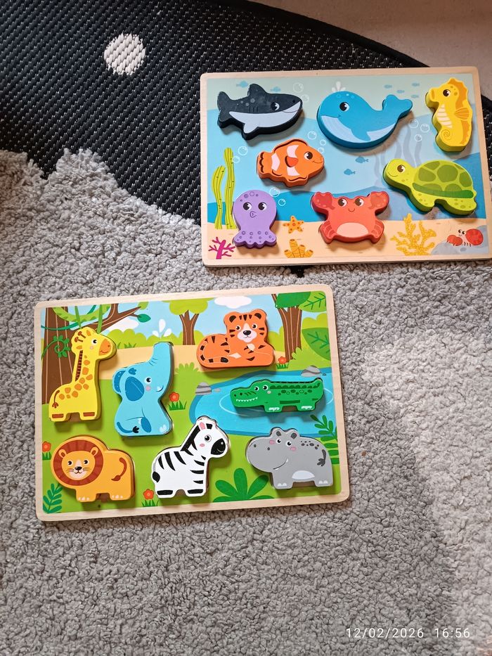 Maison non fumeur Sans animaux Bonjour, Je vends ces 2 puzzles en bois (idéal pour l'apprentissage des tout petits). Quelques pièces légèrement abîmées mais cela n'empêche pas le jeu. (Voir photos 3-5-6) Pour plus d'informations, n'hésitez pas à me contacter
