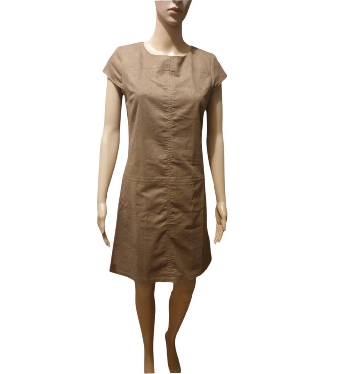 Apportez une touche d'élégance vintage et de douceur à votre garde-robe avec cette superbe robe Camaïeu.  Sa texture effet daim (suédine) offre un rendu visuel sophistiqué tout en étant extrêmement agréable au toucher.  ♥️ Une coupe droite légèrement ajustée qui met en valeur la silhouette tout en restant confortable.  💛 On craque pour ses coutures apparentes sur le devant et sa ligne horizontale à la taille qui structurent parfaitement la pièce.  🖤 Fermeture éclair discrète au dos pour un habillage facile et une ligne épurée.  📏 Marque : Camaïeu  Taille 38 (M) Matière : 100% Polyester (aspect daim/suédine de qualité) Longeur : 85cm 🌟 Très bon état  💡 Suggestion look : Accessoirisez-la avec une ceinture fine pour marquer la taille ou portez-la sous un trench crème pour un look d'automne irrésistible ! 📨 Envoi rapide et soigné