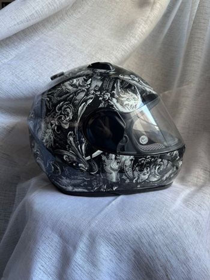 À vendre, ce superbe casque intégral Dainese au design unique et très recherché. Avec ses motifs gargouilles en noir et blanc, il offre un look à la fois sobre, agressif et élégant. Conçu sur une base technique AGV. ✨ Points forts : Finition brillante avec détails type "Renaissance / Tattoo". Fermeture par boucle Double D. Poids optimisé de 1480g. Fabrication Italienne. 📝 Détails techniques : • Marque : Dainese • Taille : XL (Tour de tête 62 cm) • État : Très bon état général. L'intérieur est propre, les mousses sont fermes. La déco extérieure est impeccable. • Visière : Visière transparente d'origine. À noter quelques légères traces d'usures (voir photo) qui ne gênent absolument pas la conduite. • Hygiène : Le casque n'a jamais subi de choc ni de chute. 📦 Envoi : Le casque sera expédié dans un emballage sécurisé pour éviter tout dommage durant le transport. Envoi rapide via le transporteur de votre choix. N'hésitez pas à jeter un coup d'œil à mes autres articles 👀, Il y a des promos sur les lots 🌸✨
