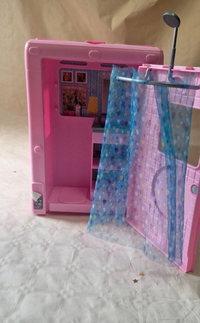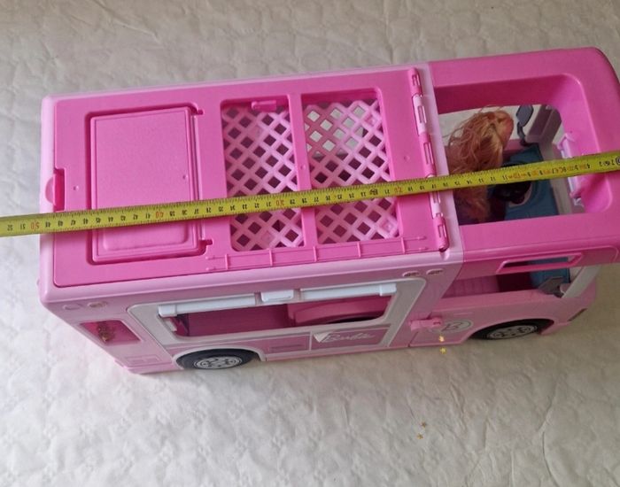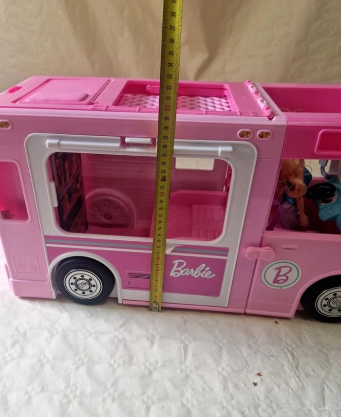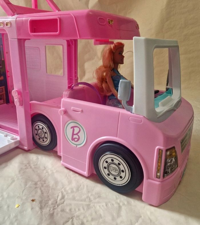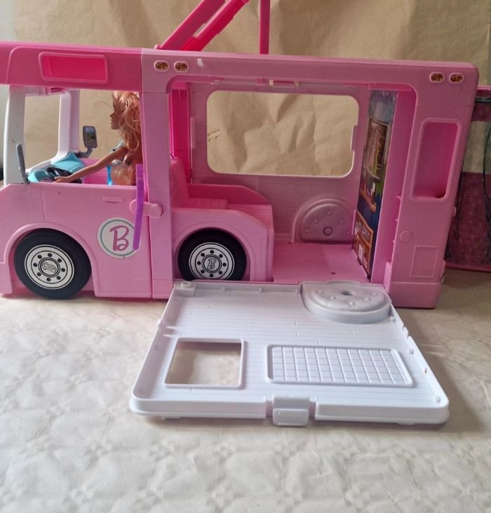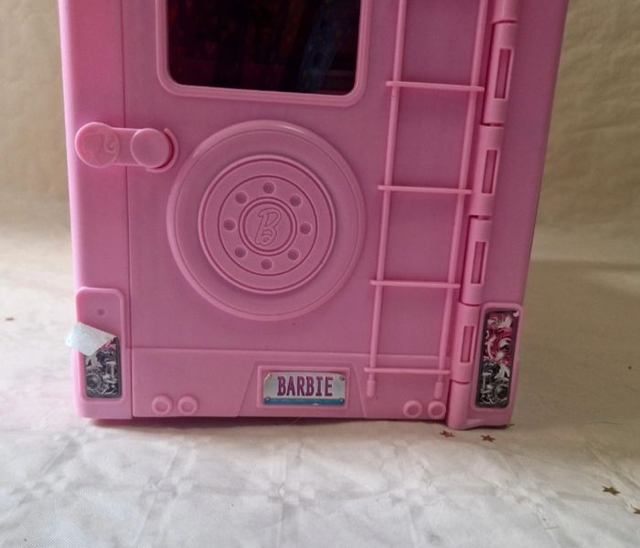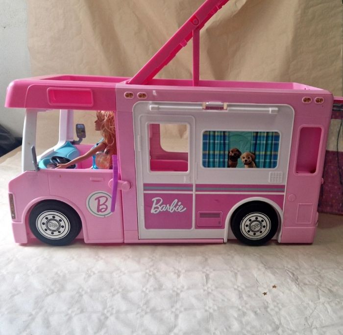 Bonjour. ​Véhicule de type camping-car transformable pour poupée Barbie, modèle Mattel 2019. L'objet est de couleur rose avec des stickers décoratifs sur les parois. ​Description de l'état : ​Le véhicule est vendu seul : sans accessoires d'origine (mobilier de cuisine, accessoires de camping, etc.). ​Vendu avec une poupée mannequin qui n'est pas de la licence Barbie .(cheveux blonds, robe bleue). ​Présence de marques d'usure légères sur le plastique et certains stickers. ​Le mécanisme de transformation (toit ouvrant, parois latérales) est fonctionnel. ​Dimensions : environ 50 cm de longueur et 30 cm de hauteur en position fermée. ​ #barbie #mattel #campingcar #jouet #poupée #collection