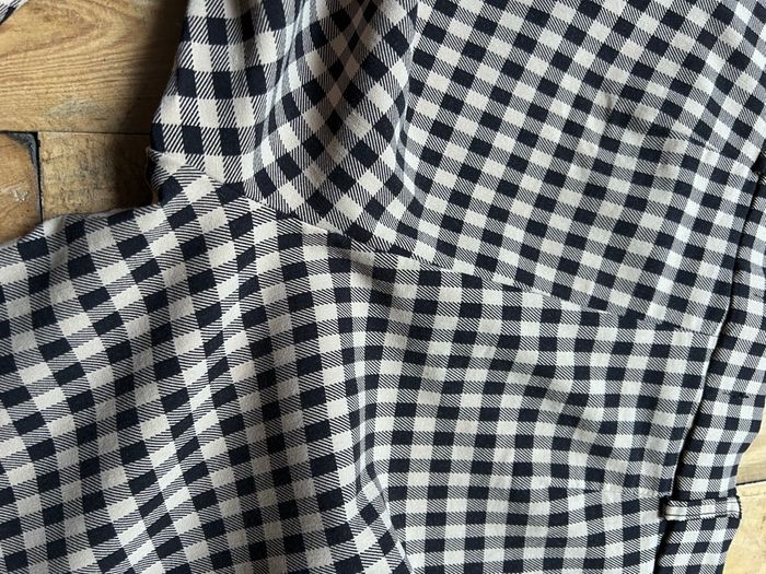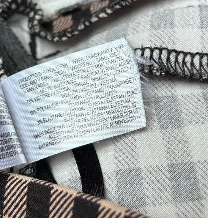 Pantalon Vichy beige et noir Meilleure couleur sur la deuxième photo où se trouve l’étiquette Taille européenne 40 Primark 78 % viscose, 19 % polyamide 3 % élasthane La ceinture mesure à plat 36,7 cm, va jusqu’à 46 cm en tirant Longueur côté 99,5 cm Longueur entre jambe 72 cm Largeur à plat bas des jambes 13,4 cm