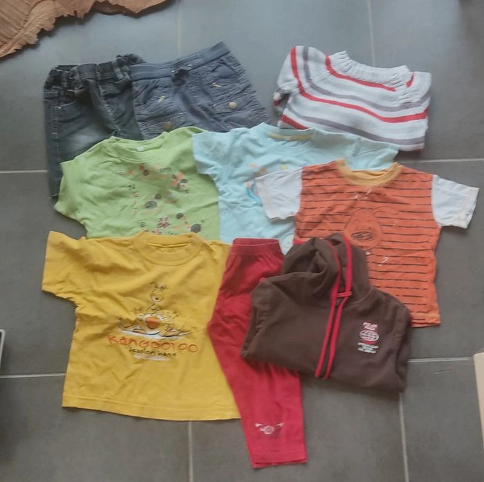 Lot 9 vêtements : 🔸4 tshirts, 🔸2 shorts, 🔸1 gilet zippé 🔸1 pantalon pyjama 🔸1 pull rayé Taille 24 mois Bon état Plusieurs marques