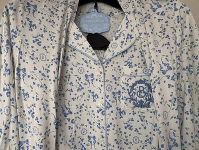 Un pyjama boyfriend Bridgerton à motif floral, armoiries brodées et passepoil contrasté. TAILLE : XS.
