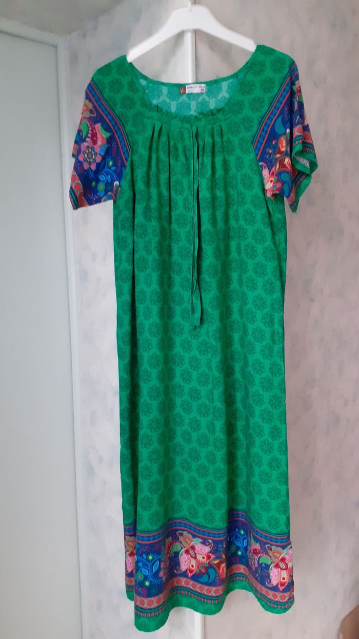 Vends une robe longue manches courtes raglan, en viscose, couleur vert avec motifs, marque Rimass (Maroc), taille L sur l'étiquette, 40-42. Longueur de l'épaule à la base : 110 cm Largeur aisselle à aisselle : 54 cm Largeur au niveau des hanches : 59 cm.