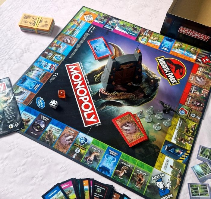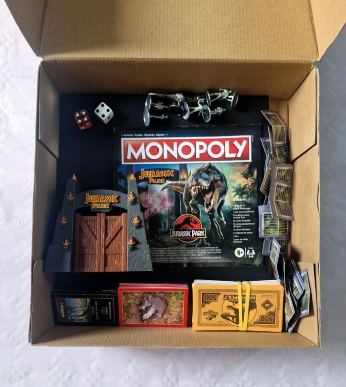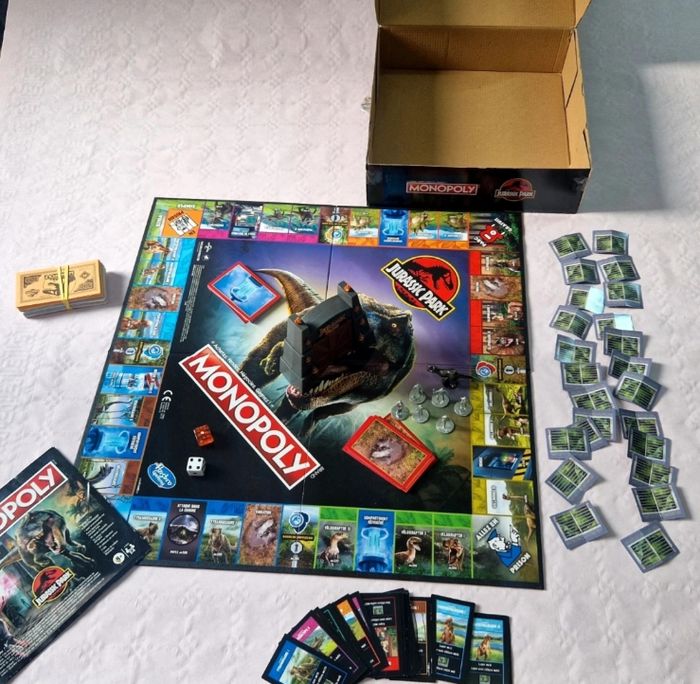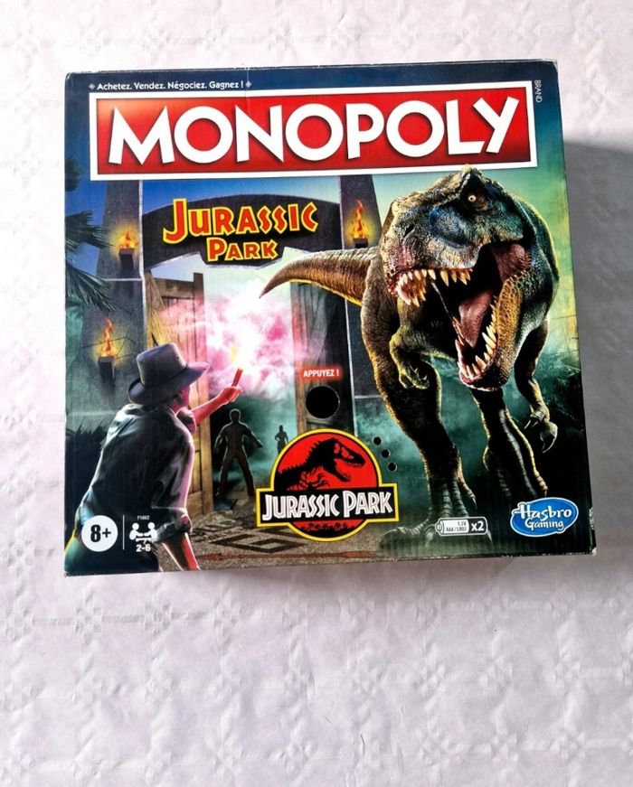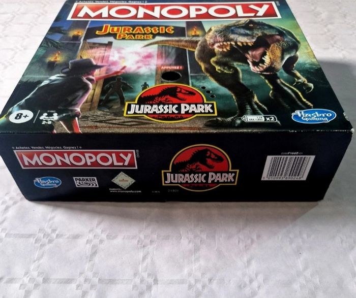 Bonjour. ​Je vends ce jeu de société Monopoly sous licence Jurassic Park. ​Détails : Ce modèle inclut un portail électronique qui diffuse la musique emblématique du film. Le plateau et les cartes sont entièrement personnalisés avec les dinosaures et les lieux de la saga. ​État physique : L'objet a été utilisé. La boîte en carton présente de légères marques d'usure. Le plateau de jeu et les accessoires intérieurs sont en bon état et propres. ​Complétude : Le jeu est complet avec sa boîte et sa notice. Il comprend : ​1 plateau de jeu. ​6 pions personnages en métal et 1 pion T-Rex. ​1 portail électronique (sonore). ​28 cartes Propriété, 16 cartes Compartiment réfrigéré, 16 cartes Vibration. ​24 clôtures en carton. ​2 dés et la liasse de billets Monopoly. ​ #monopoly #jurassicpark #hasbro #jeuxdesociete #dinosaures #collector