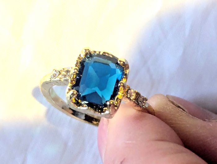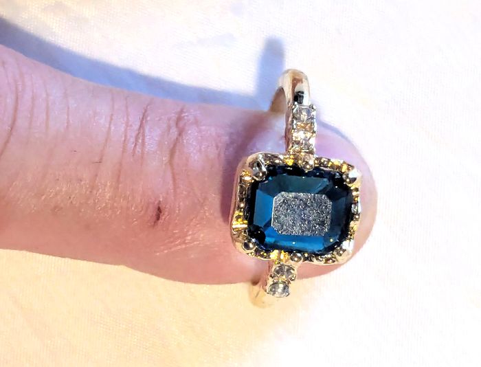 Bague Fine Grosse Pierre Rectangulaire Bleue Socle Pierres Blanche Strass Bijou Doré Fantaisie Femme - photo numéro 1