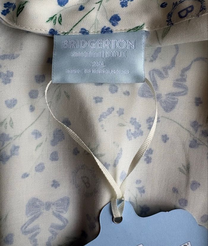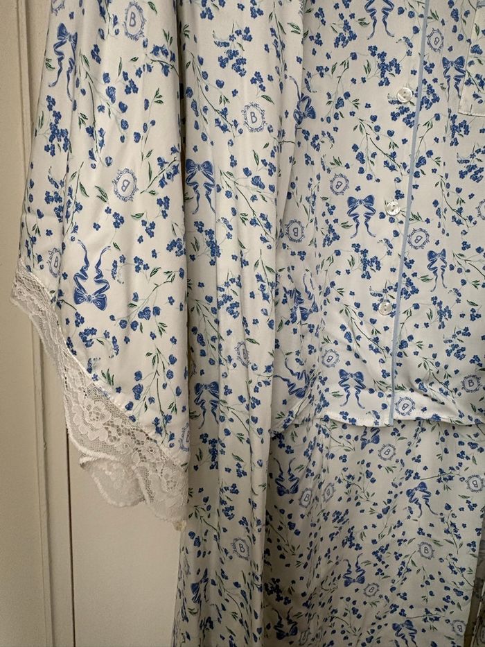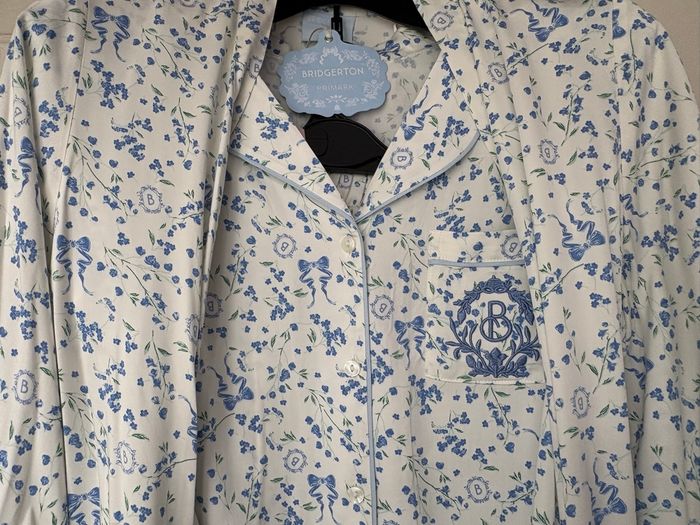 Un pyjama boyfriend Bridgerton à motif floral, armoiries brodées et passepoil contrasté et un peignoir croisé mi-long à motif floral bleu, finitions en dentelle et manches ange. TAILLE : XXL.