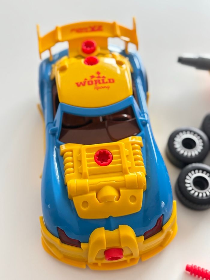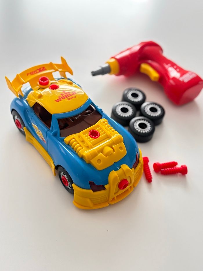 pour Enfants Construction 30 Pièces avec Perceuse Électrique, Voiture Démontable avec Lumières LED et Sons (Inclut 3 Vis de Rechange) Piles fonctionnent dans la voiture et dans la perceuse