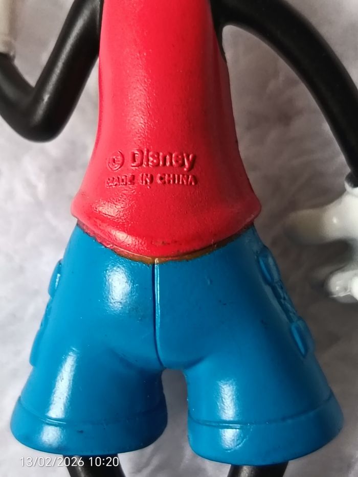Je vends cette figurine vintage de Dingo, le plus gaffeur des personnages Disney. Il est représenté ici dans un look d'été avec un débardeur rouge et un short de bain bleu à motifs. Marque : Authentique Disney (marquage officiel au dos). Dimensions : Mesure 8 cm de hauteur. Collection : Idéal pour compléter une collection de figurines Disney classiques. Merci de bien consulter les photos pour les détails : Peinture : Quelques petits manques de peinture visibles (notamment sur le nez et le bout des gants), dus à son ancienneté. Structure : Pas de casse, la figurine tient parfaitement debout. Authenticité : Gravure "© Disney - Made in China" bien lisible à l'arrière. #skms62141_disney #Disney #Dingo #Goofy #FigurineDisney #DisneyVintage #MickeyEtSesAmis #CollectionDisney #JouetVintage #Figurine8cm #DisneyFan