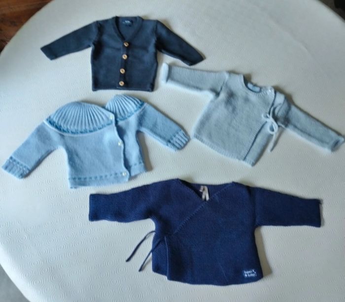 * 4 gilets : un en tricot bleu clair vintage Colin et Colinne en fermeture cache coeur, un en tricot à nuances de bleus, sans marque, un en tricot bleu marine à fermeture cache coeur de la marque Orchestra et un bleu marine Kiabi (acheté neuf en magasin).