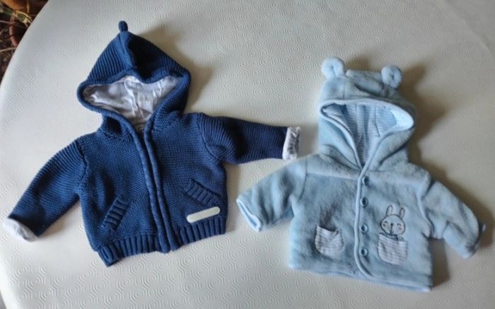 * 2 manteaux : un en laine marine à coudières blanc et gris, capuche dinosaure, Gémo ; un velours bleu clair avec petites poches et motif lapin, capuche oreilles d'ours, Tissaia ; parfait état général.