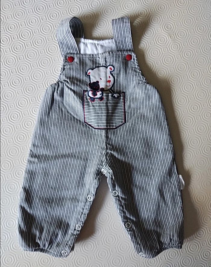 * 1 salopette bleu marine rayé blanc, motif ours et nounours avec détails en rouge, ouverture par pressions à l'entrejambe, parfait état.
