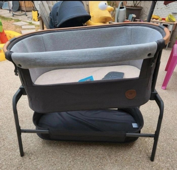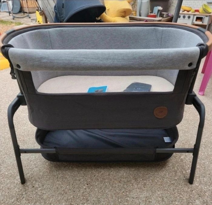 Comme neuf, très peu utiliser. Manuel d'utilisation, matelas et rangement en dessous. Se règle de haut en bas d'avant en arrière et fixation possible au lit parental.
