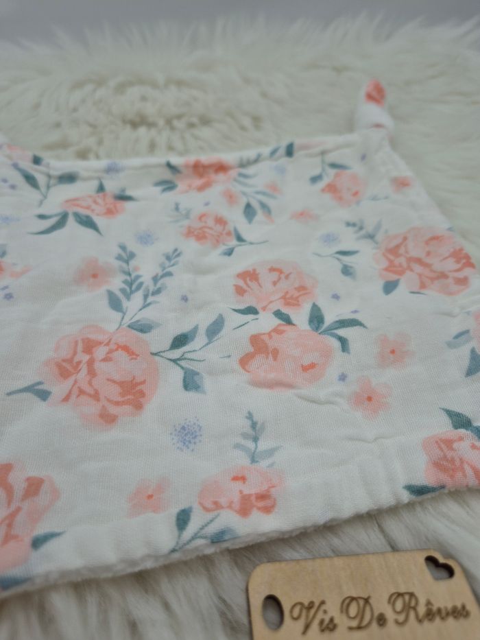 Doudou carré plat en tissu lange blanc imprimé de roses. 4 noeuds.