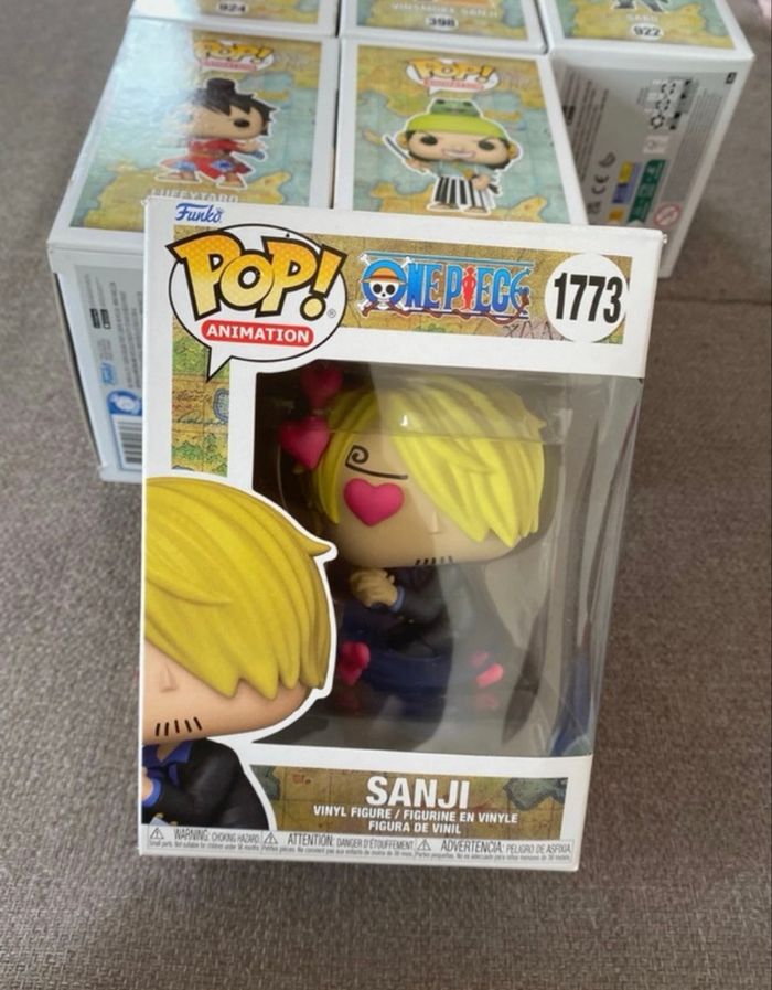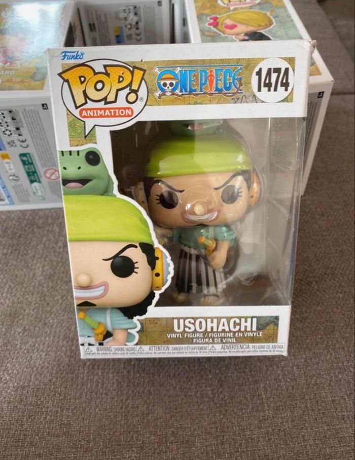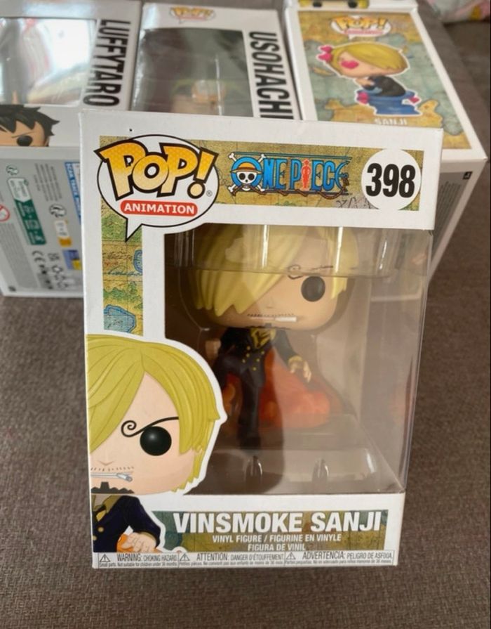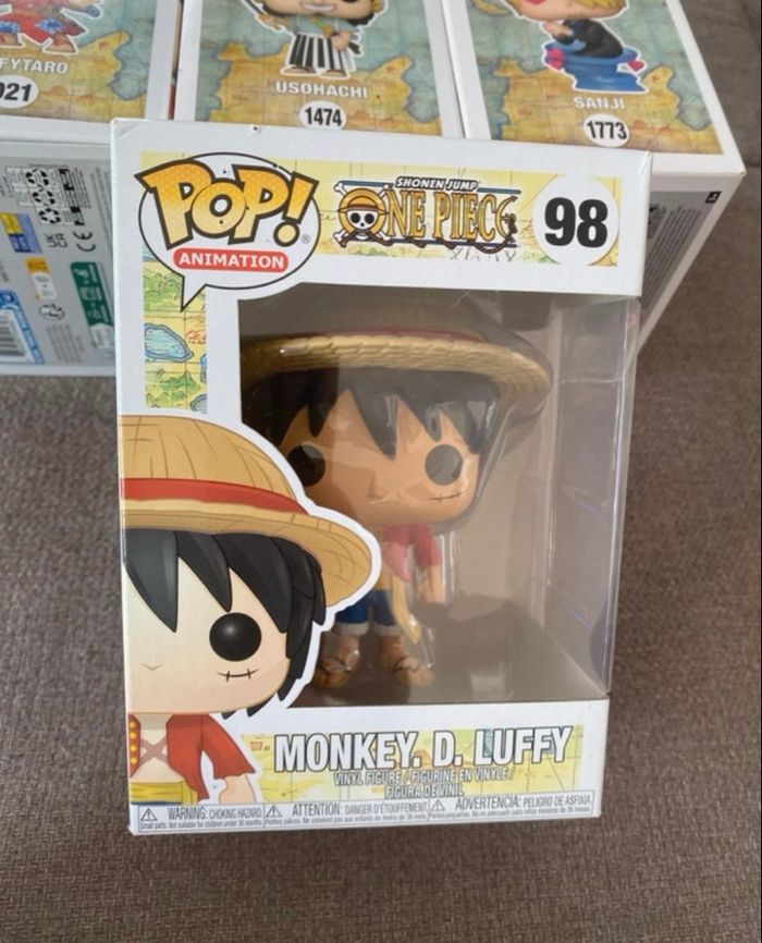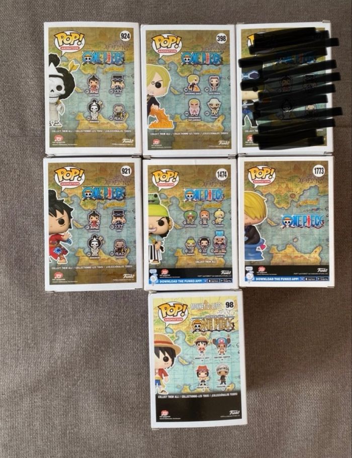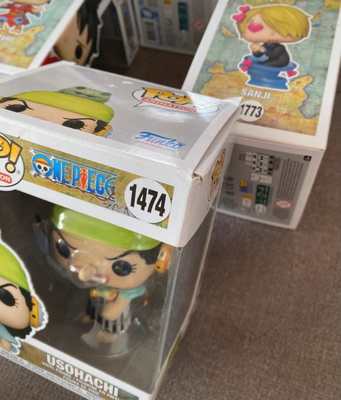 Lot de six POP One Piece : - Bonekichi 924 - Vinsmoke Sanji 398 - Sanji 1773 - Monkey D.Luffy 98 - Usohachi 1474 (haut de la boîte légèrement abîmée) - Luffytaro 921 Figurines en vinyle Neuves, jamais sorties de leurs boîtes Vous achetez ce que vous voyez sur les photos